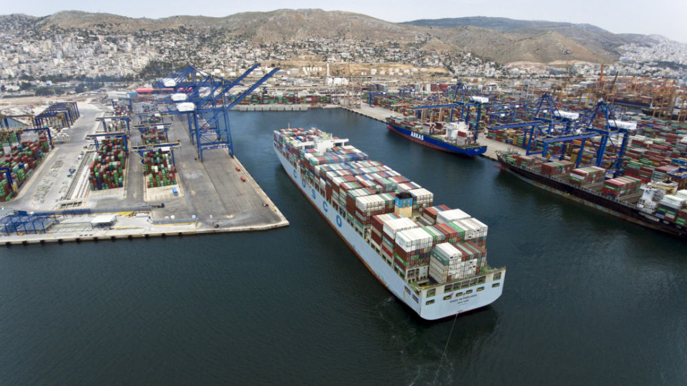 这是2017年5月7日,中远海运的货船驶出比雷埃夫斯港(比港)集装箱码头。 新华社发(帕诺斯·托马达基斯 摄)