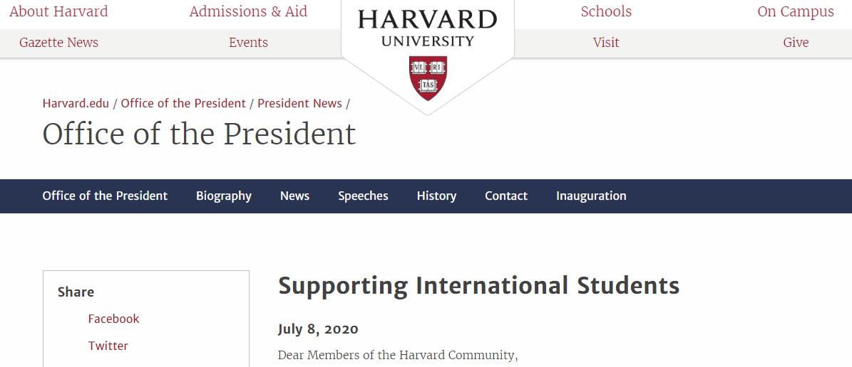 △哈佛大学校长办公室发声支持留学生
