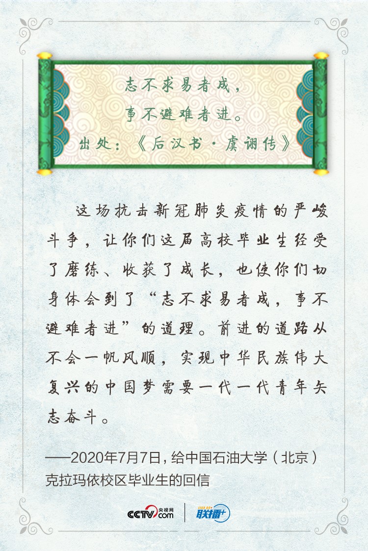 “这场抗击新冠肺炎疫情的严峻斗争,让你们这届高校毕业生经受了磨练、收获了成长,也使你们切身体会到了‘志不求易者成,事不避难者进’的道理。前进的道路从不会一帆风顺,实现中华民族伟大复兴的中国梦需要一代一代青年矢志奋斗。”