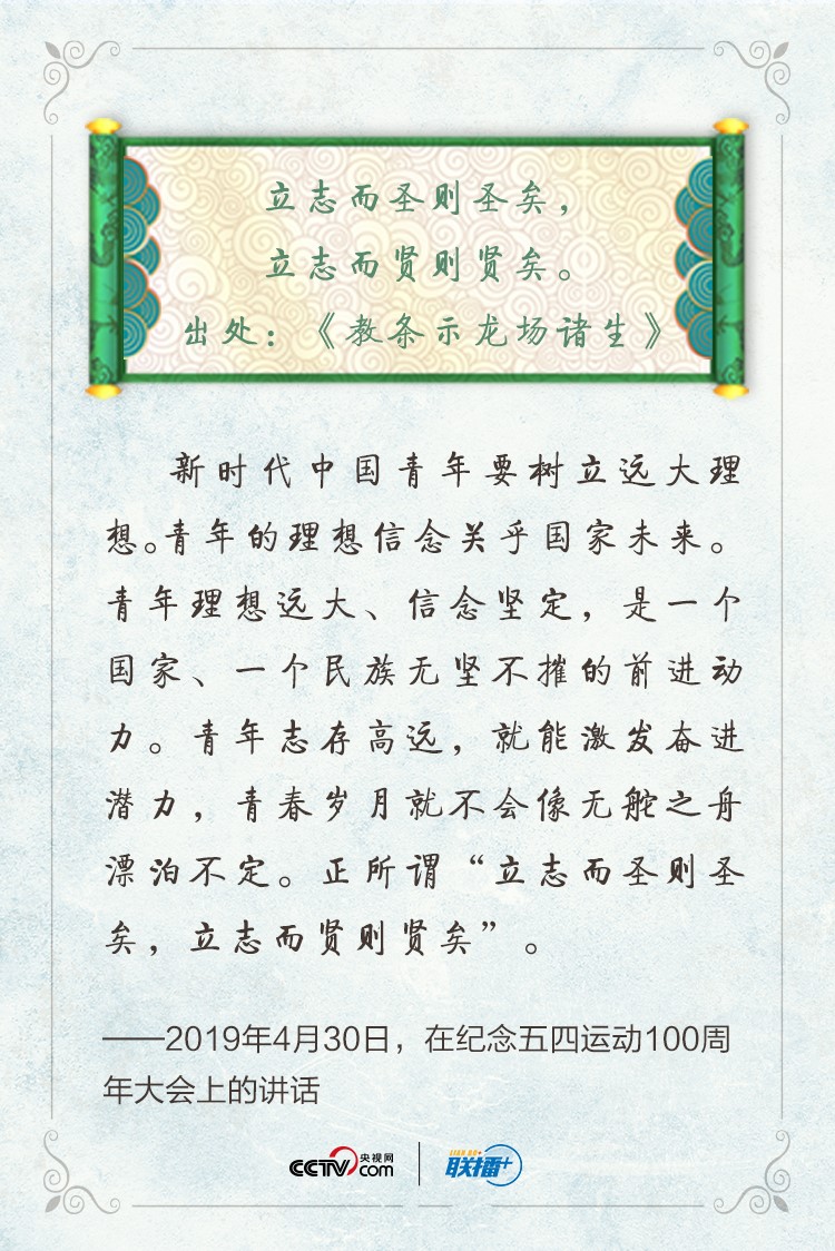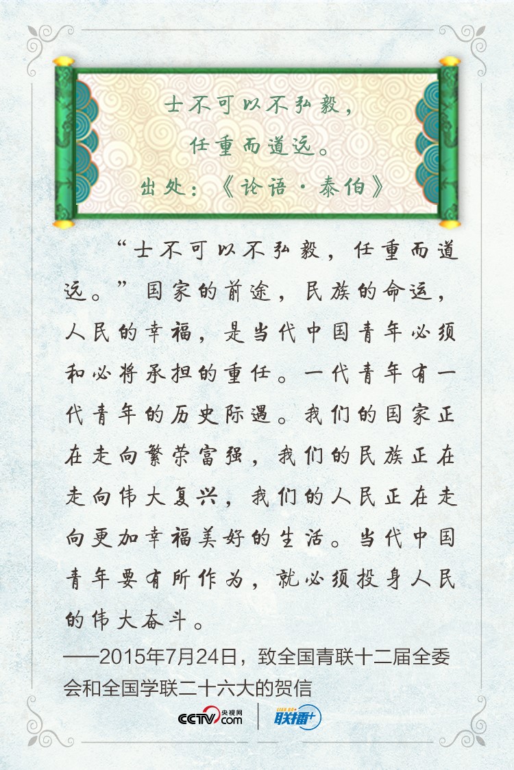 青年兴则国家兴,青年强则国家强。党的十八大以来,习近平总书记在同青年谈心、给青年回信、参加青年活动时多次引用古文诗句勉励青年,为青年走好人生路提供强大精神指引。央视网《联播+》特梳理,与您共同感悟习近平总书记对青年的深情寄望。