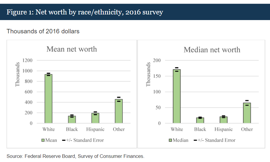 一份美联储2016年的调查显示,美国非裔家庭的平均财富水平,大约是17600美元。相对白人家庭171000美元的平均财富水平来说,非裔家庭的平均财富水平也就只有白人家庭的十分之一左右。