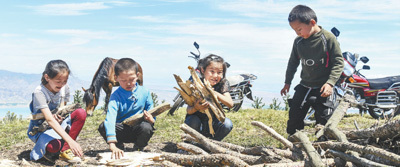 在新疆伊犁特克斯县境内的夏牧场里,小朋友在帮家人拾柴。