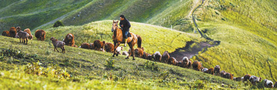 在同一夏牧场里,牧民在放牧。