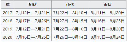 下图是近4年的入伏日期,事实上每年入伏的日子都不一样,但近几年“三伏”都是40天,这是为什么呢?