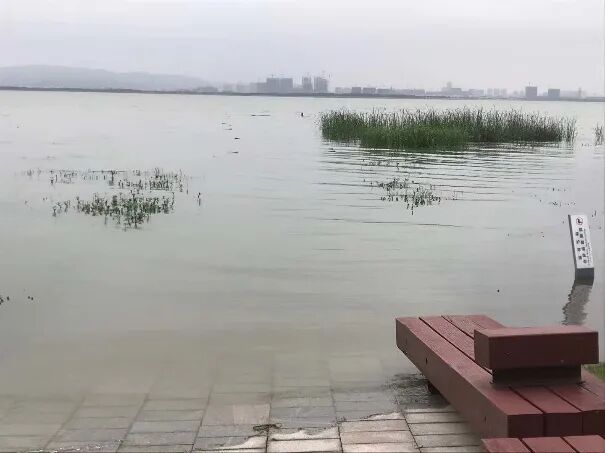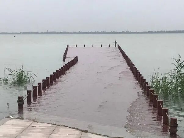 连续雷暴雨,东太湖水位持续上升,湖边观光栈道码头被淹。(汪宏胜 摄)