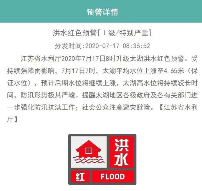 7月17日,受持续强降雨影响,太湖平均水位上涨至4.65米,预计后期水位将继续上涨,太湖高水位也将持续较长时间。17日8时,江苏省水利厅2020年7月17日8时升级太湖洪水红色预警。