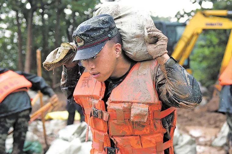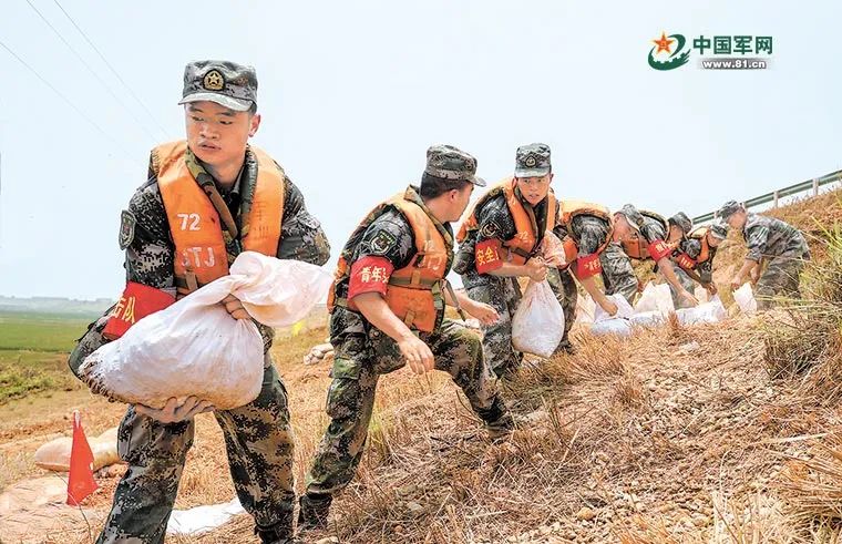 “让老乡撤出来,我们来守岛。”16日,安徽省安庆市迎江区“江心洲”洪水超过警戒水位,岛上多处民房被淹。第71集团军某旅突击二连官兵闻令而动,以轮渡方式上岛对管涌处进行封堵。截至18日,岛上居民已经全部撤出。18日7时50分,长江南京站水位已涨至10.26米,长江二桥天河口段江水漫堤在即。江苏省南京警备区集结95名民兵应急队员经过3小时奋战,搬运沙袋5600余个,完成了200余米江堤的加高。