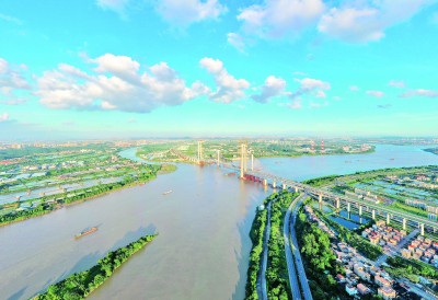 粤港澳大湾区基础设施“硬联通”重点工程广州南沙港铁路跨西江特大斜拉桥接近合龙。新华社发