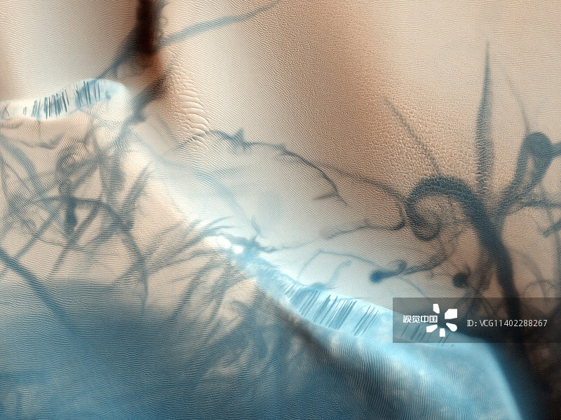 2009年10月21日消息,最新公布的火星表面高清晰照片显示出因沙尘活动而显的纵横交错的阴影图案。