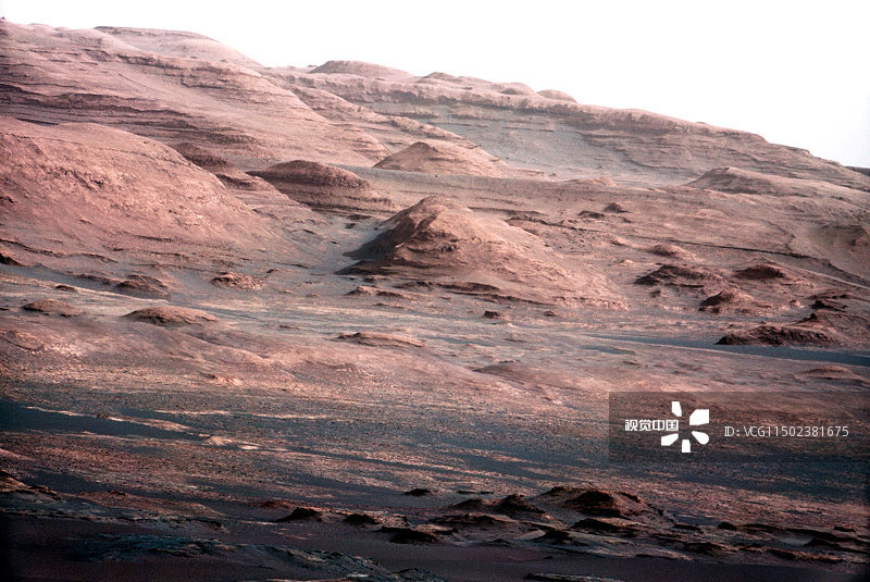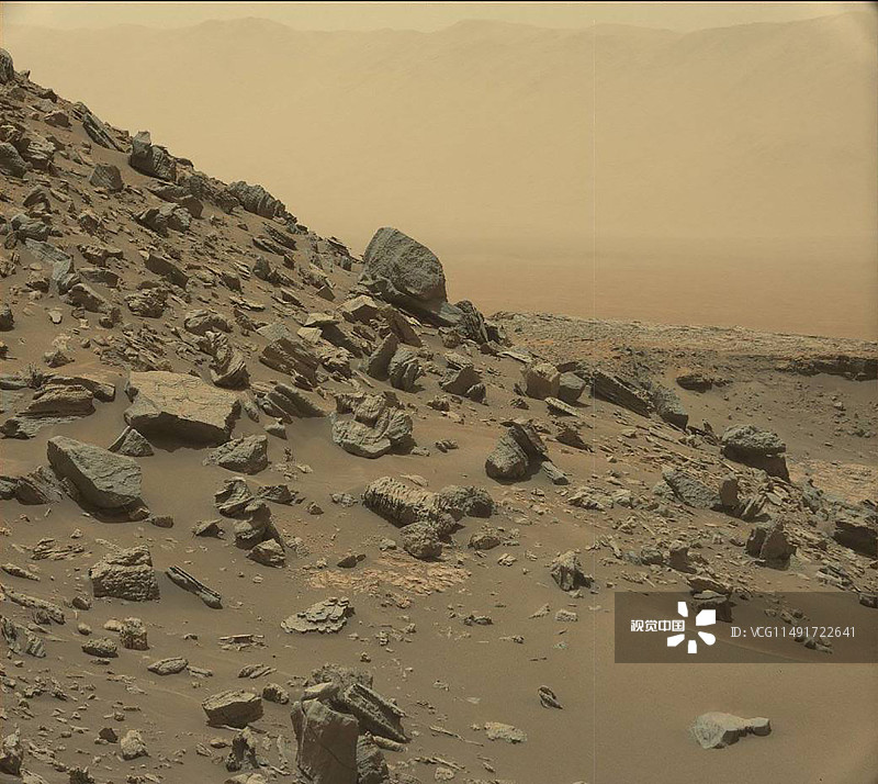 当地时间2012年8月23日,夏普山,好奇号的目的地。这张图是利用位于“好奇”号遥感桅杆右侧的100毫米焦距远摄镜头相机拍摄的,科学家根据地球上的光照条件调整了这张图的颜色,以帮助分析火星地形。
