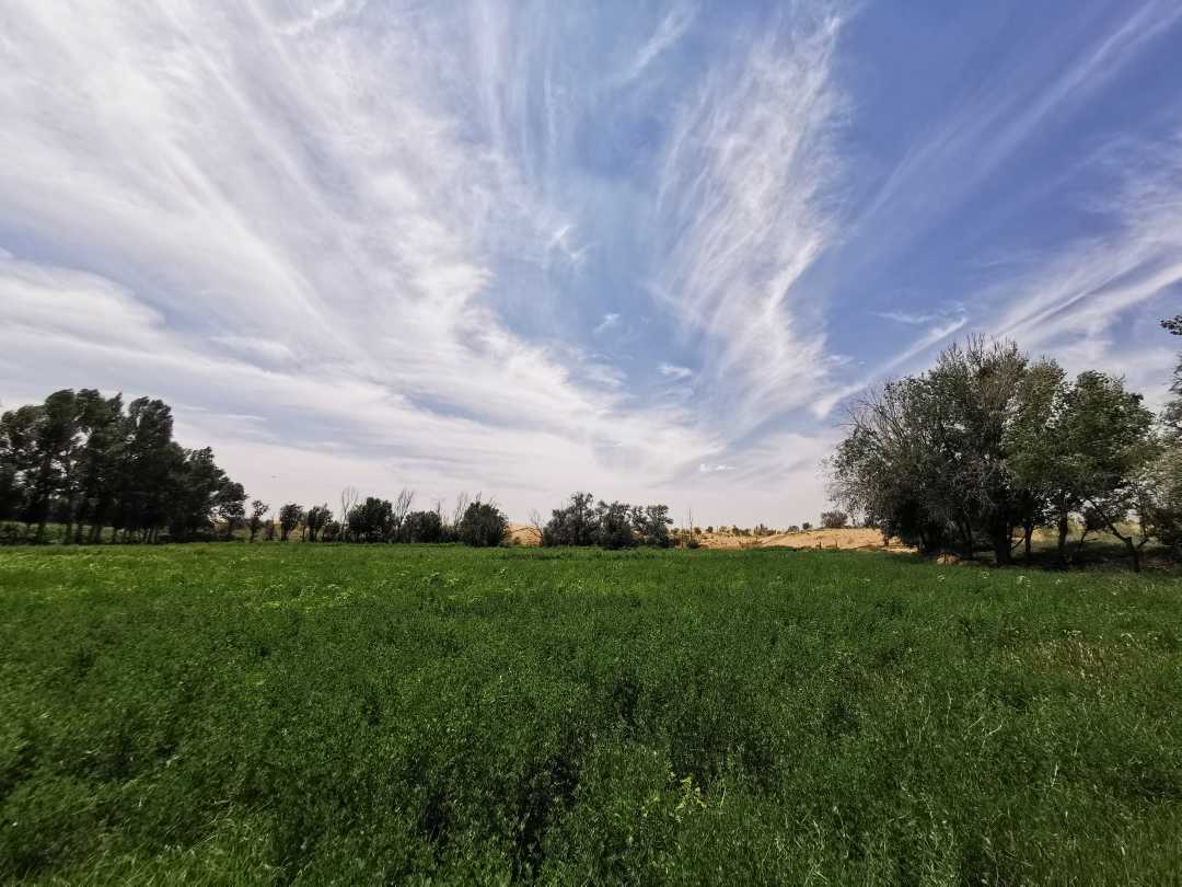 苜蓿地与沙漠和谐共存。(本报记者 余健摄)