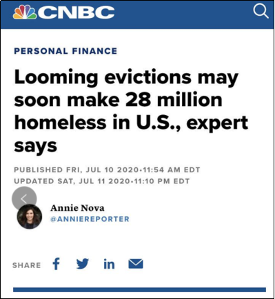 美国律师协会驱逐工作组委员会主席艾米莉·本弗表示,接下来几个月内,美国将有上千万人因付不起房租而流落街头:“我们可以预期,这种情况将会大幅增加,特别是在有限的支持和救助措施开始失效的情况下。”