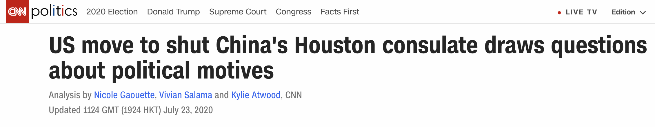 美国有线电视新闻网(CNN)23日报道称,美方要求中方关闭驻休斯敦总领馆的举动引发民众对其政治动机的质疑。
