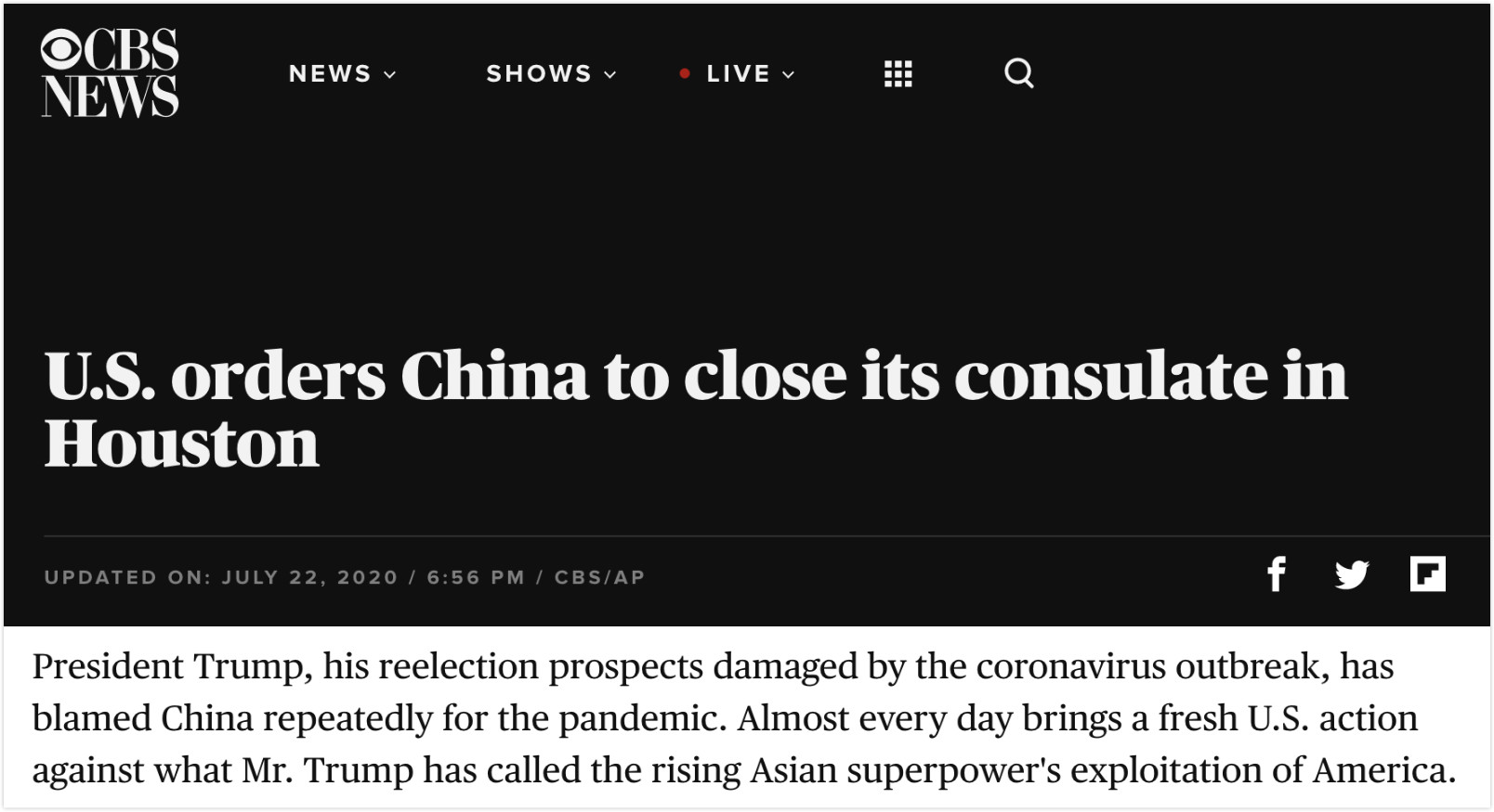 24日,中国外交部通知美国驻华使馆,中方决定撤销对美国驻成都总领事馆的设立和运行许可,并对该总领事馆停止一切业务和活动提出具体要求,作为对美方21日突然要求中方关闭驻休斯敦总领馆的反制措施。美国政府这一行为引发多方关注,其政治动机遭到了外媒和学者的质疑。
