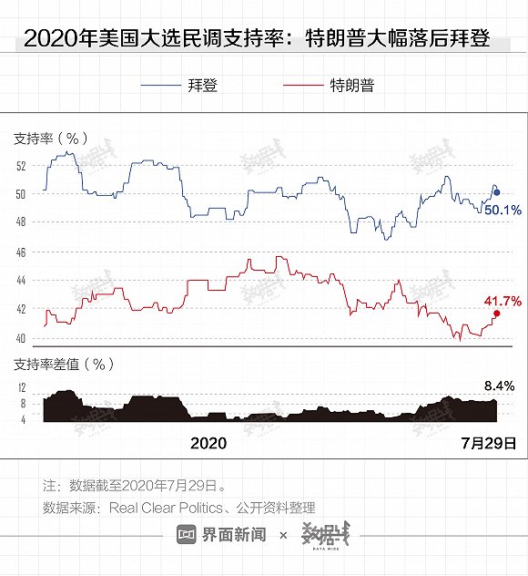 随着8月共和党全国代表大会日期临近,美国2020年大选即将进入冲击阶段。美国政治新闻网站Real Clear Politics最新的民调数据显示,目前特朗普的支持率远远落后于民主党候选人拜登。截至7月30日,特朗普支持率为41.6%,落后拜登8.3个百分点。