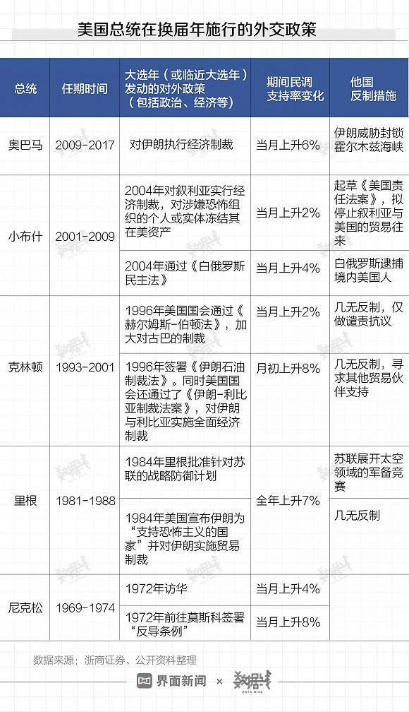 历史上美国多位总统均曾在大选年以经贸、外交打压他国的形式获取“政绩牌”。1956年和1984年,美国总统艾森豪威尔和里根在贸易领域施压日本,二人支持率随后明显反弹,最终双双连任成功。美国上一任总统奥巴马在临近大选不足4个月时大幅升级对伊朗的制裁措施,单月民调支持率上升6%,最终也成功连任。