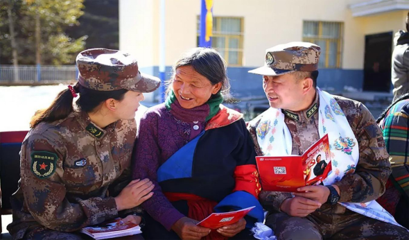 军队在参与脱贫攻坚中,坚持进村入户宣传党的惠民富民政策,传递党的声音,引导群众坚定听党话、跟党走、脱贫困、奔小康。图为2018年10月,青海省军区藏汉双语小分队深入藏乡牧区宣传党的创新理论和惠民政策。中央军委政治工作部供图