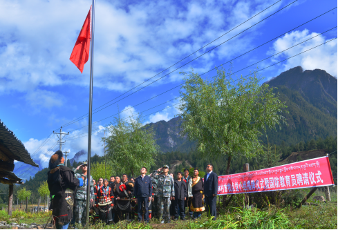 边防官兵与抵边放牧群众共同升国旗。中央军委政治工作部供图