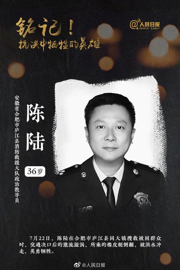 陈陆,生前系安徽省消防救援总队合肥市庐江县大队政治教导员。2020年7月18日至21日,合肥市普降暴雨,庐江县遭受百年一遇洪灾,多条河流水位超过历史峰值。陈陆带领大队指战员辗转5个乡镇,奋战96小时,成功转移和救出群众2665人。7月22日,陈陆在执行庐江县连河村抗洪抢险任务中壮烈牺牲,年仅36岁。