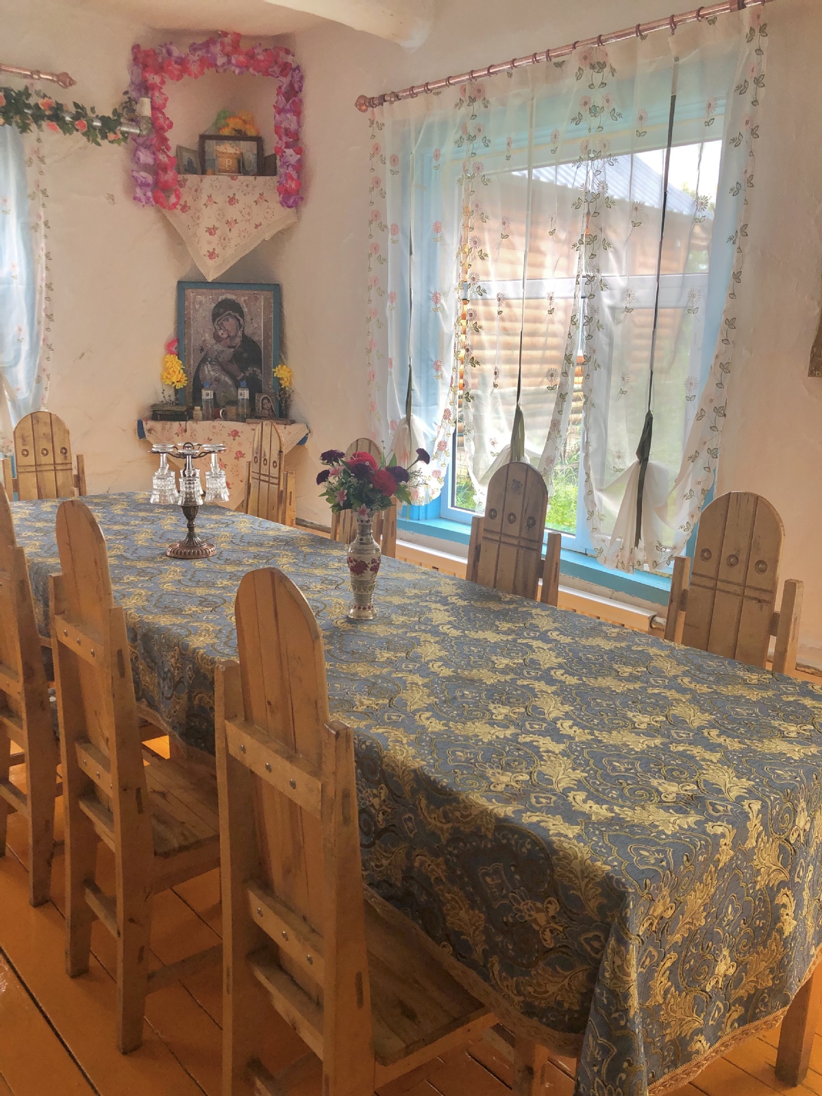 “瓦西里”家庭的餐厅,房屋材料以圆木和木板为主,房屋主体以圆木叠摞而成,屋子冬暖夏凉。