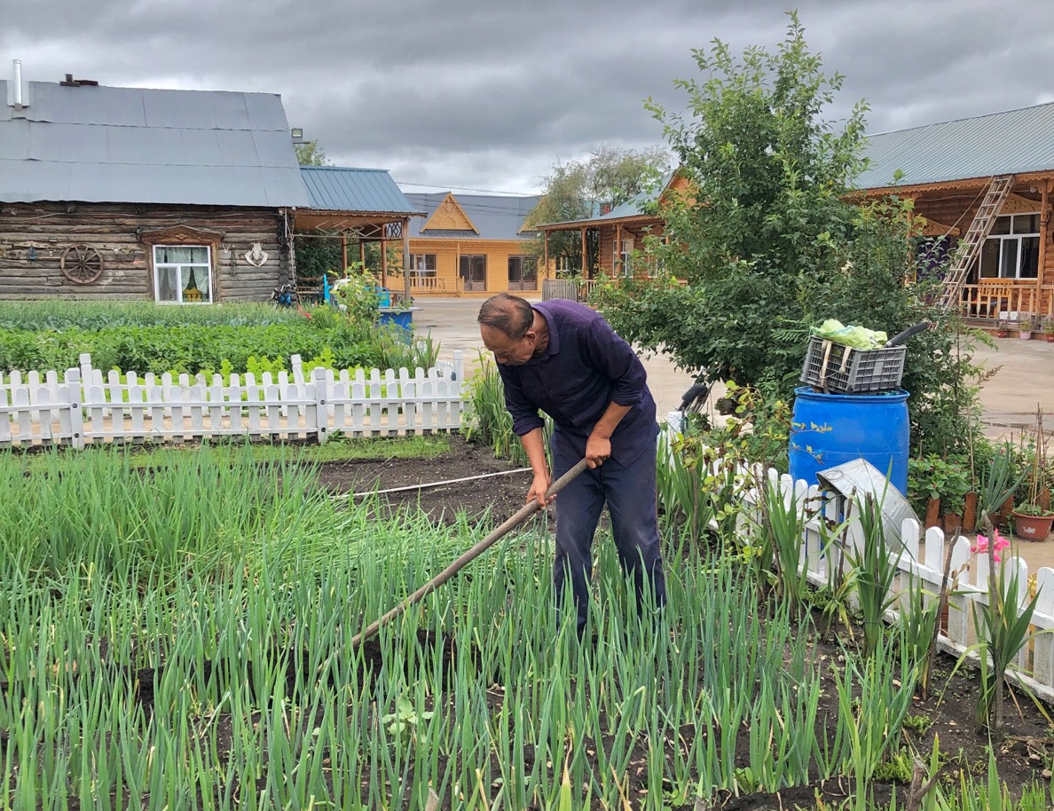 男主人儿子的岳父在自家的“家庭游”里劳作。俄罗斯族最常见菜肴有熏烤类、蔬菜类、汤类和腌菜。