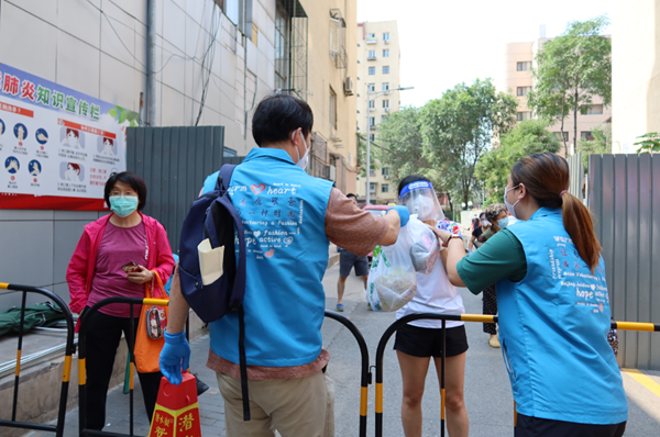 北京新发地市场发生聚集性疫情后,玉泉东市场周边20个小区实施应急封闭管理,社区居民生活面临诸多困难。海淀区新时代文明实践中心第一时间招募志愿者来为居民服务。
