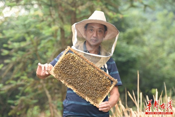 在蜜蜂飞舞的蜂箱前,贫困户阳建民“全副武装”,小心翼翼地揭开巢蜜框,上面爬满黑黄相间的小蜜蜂,黄澄澄的蜂蜜流淌下来。他告诉记者,再过段时间,又可以收割蜂蜜,借助网店卖给全国各地的网友。