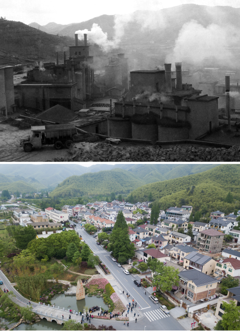 这是一张拼版照片,上图为:浙江省湖州市安吉县天荒坪镇余村1980年代的资料照片;下图为:2018年4月24日,游客在整修一新的余村游览拍照(新华社记者翁忻旸摄)。
