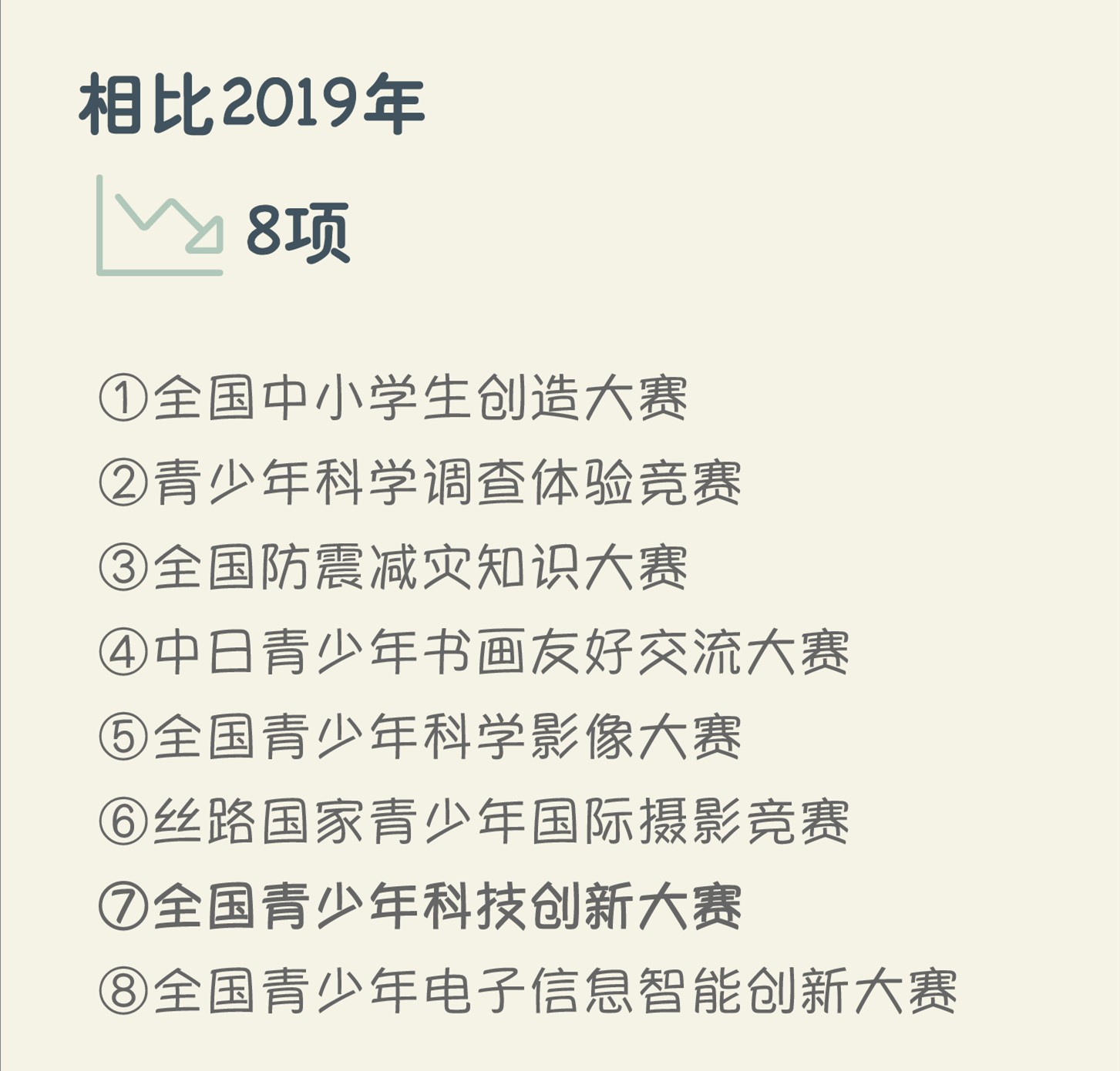 有8项比赛从名单中消失,其中就包括今年陷入获奖作品造假争议的全国青少年科技创新大赛。