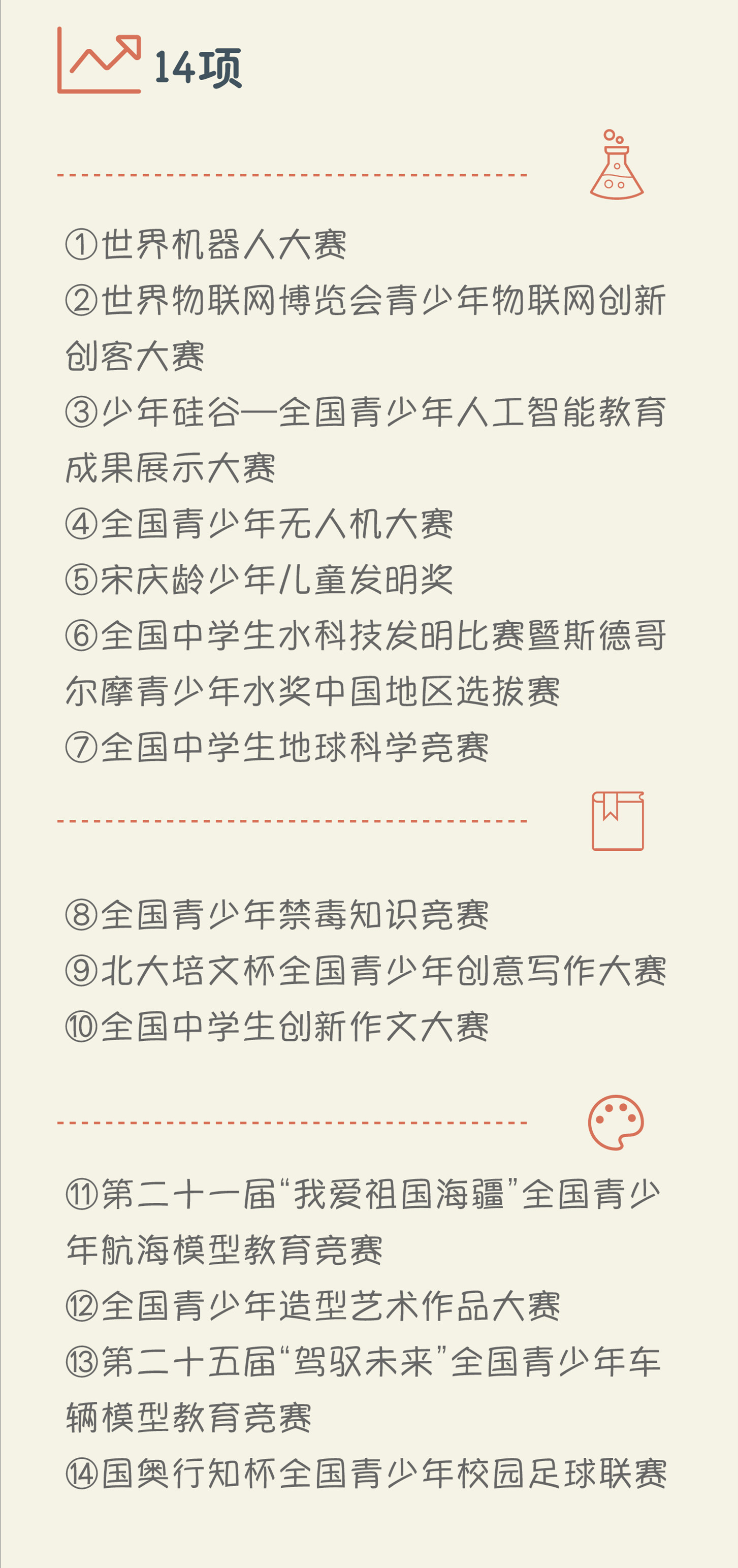全国中学生数学、物理、化学、生物学以及信息学奥林匹克竞赛均入选,而去年还在名单之列的全国青少年科技创新大赛未被列入。