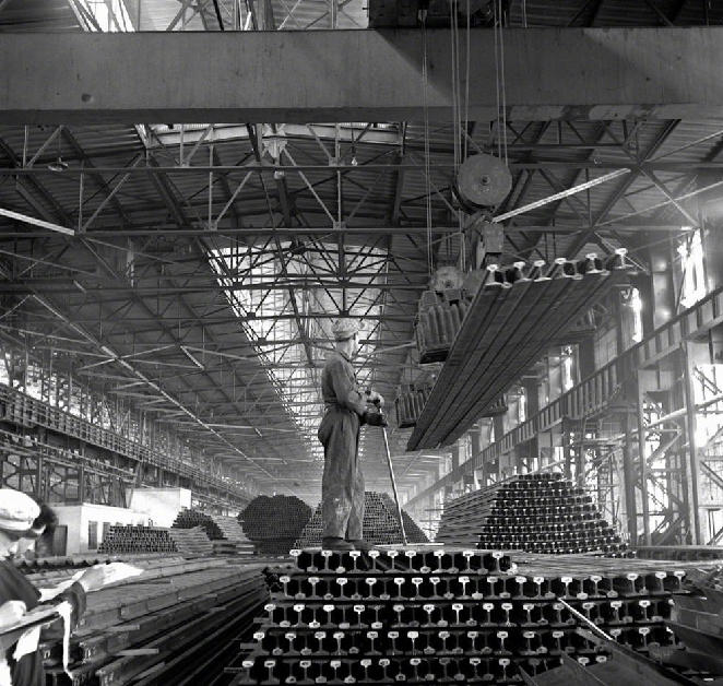 “一五”期间,鞍钢兴建的第一座大型轧钢厂生产能力已迅速超过设计标准。这是这个厂生产的大批钢轨(摄于1957年4月)。