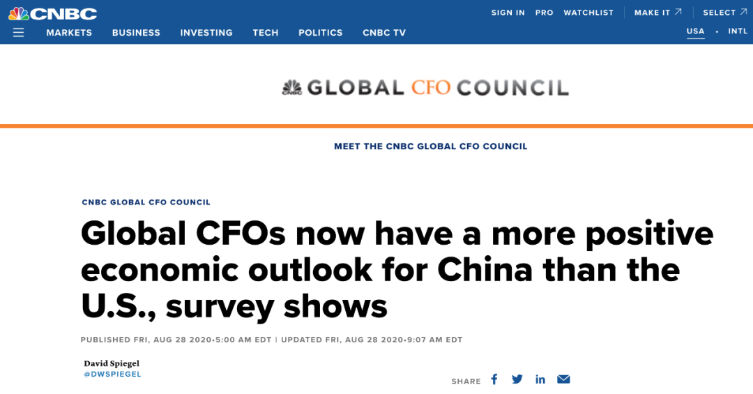 全球首席财务官对当前中美经济的评价(图片来源:CNBC)
