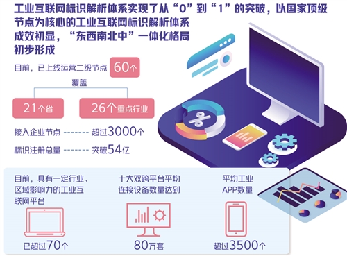 同时,工业互联网标识解析体系实现了从“0”到“1”的突破,以国家顶级节点为核心的工业互联网标识解析体系成效初显,“东西南北中”一体化格局初步形成。目前,已上线运营60个二级节点,覆盖21个省、26个重点行业,接入企业节点超过3000个,标识注册总量突破54亿。东部地区标识解析二级节点、企业节点建设领先全国。标识应用全面展开,探索出产品追溯、供应链管理、产品全生命周期管理等多种特色应用模式。