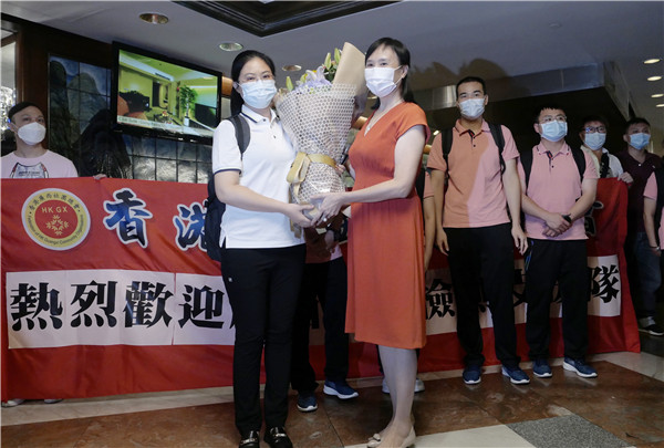 9月2日,在香港九龙维景酒店,香港广西社团总会的代表欢迎支援队队员的到来。新华社记者 王申 摄