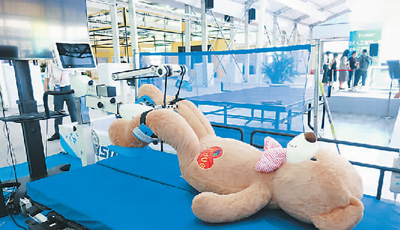 服贸会服务机器人展馆内,参展商用玩具熊做康复训练展示。
