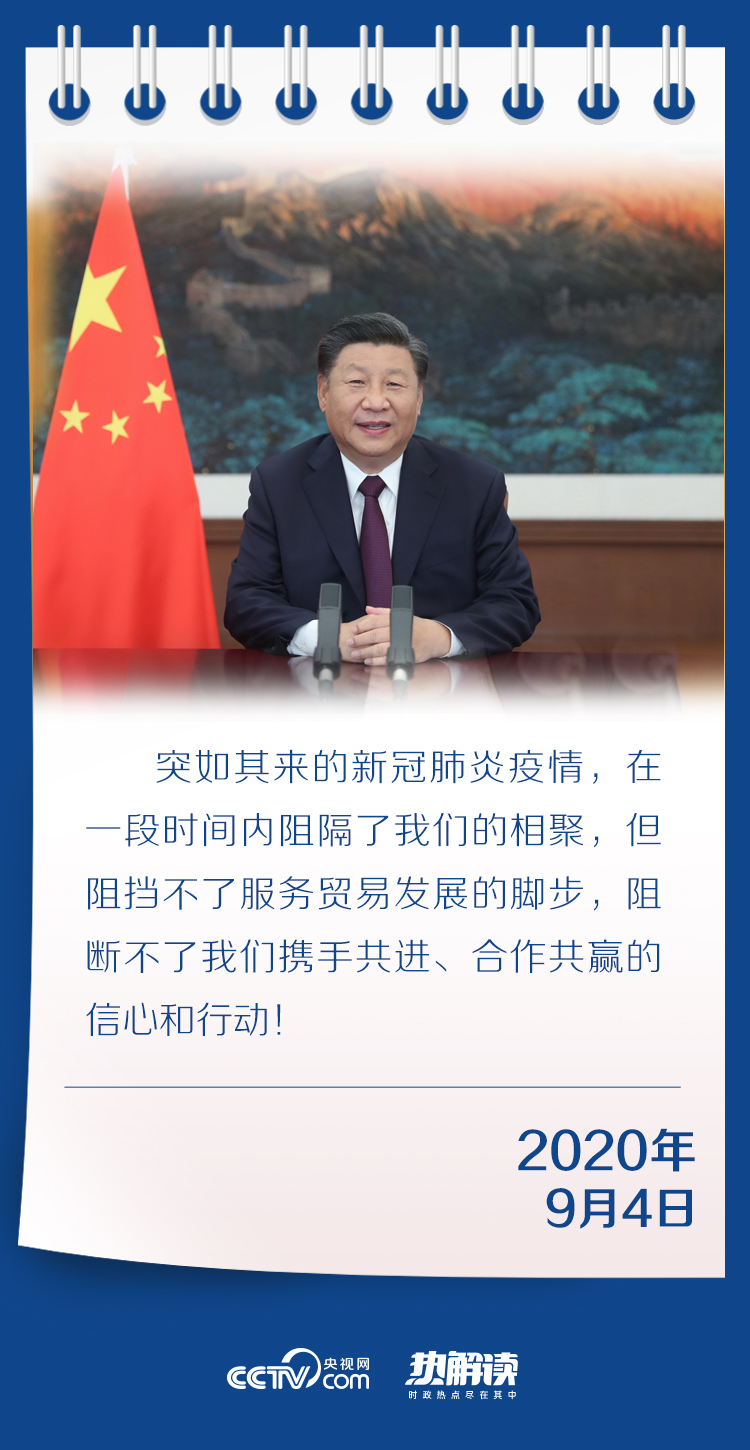 习近平主席在2020年中国国际服务贸易交易会全球服务贸易峰会的致辞中提出3点倡议:共同营造开放包容的合作环境;共同激活创新引领的合作动能;共同开创互利共赢的合作局面。