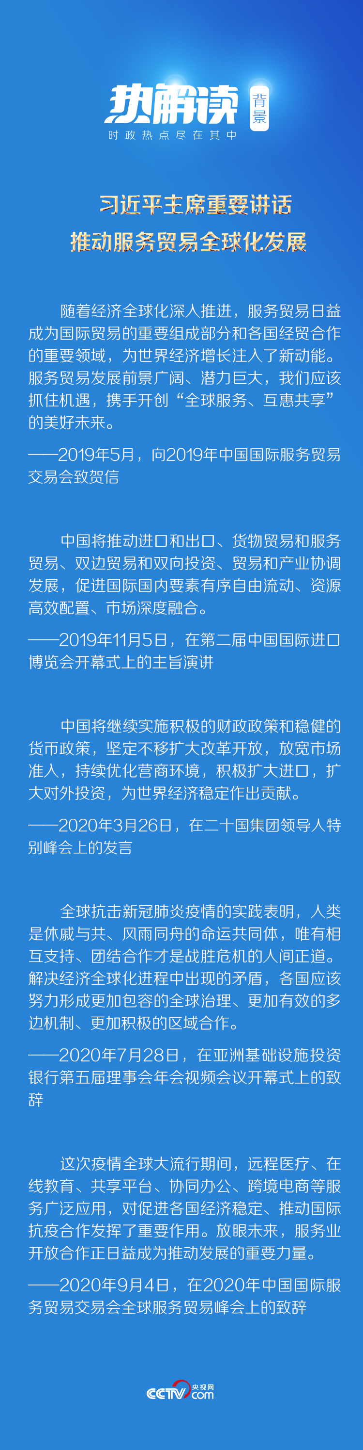 2020年中国国际服务贸易交易会简称2020年服贸会。在新冠肺炎疫情全球大流行背景下,2020年服贸会是我国今年在线下举办的第一场重大国际经贸活动。习近平主席在致辞中坚定地表示:“就是要同大家携手努力、共克时艰,共同促进全球服务贸易发展繁荣,推动世界经济尽快复苏。”