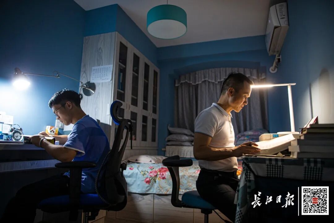 父子俩经常背靠背看书学习