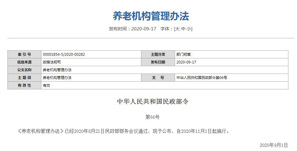 民政部17日发布《养老机构管理办法》,将于2020年11月1日起施行。《办法》指出,政府投资兴办的养老机构,可以交由社会力量运营管理。