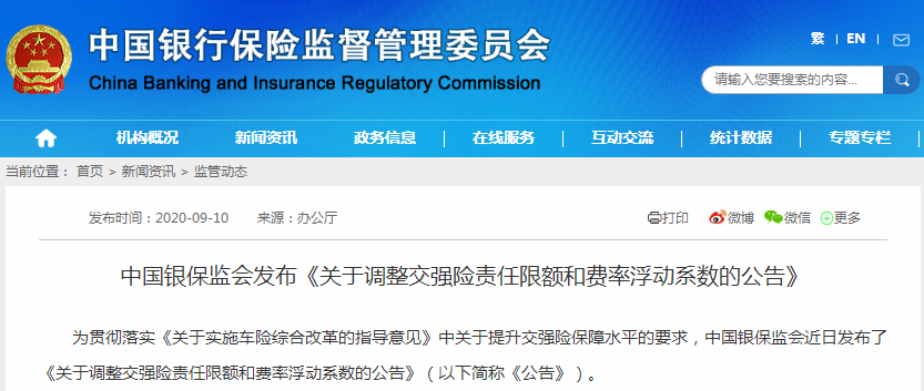 根据银保监会发布的《关于调整交强险责任限额和费率浮动系数的公告》,提升交强险保障水平。