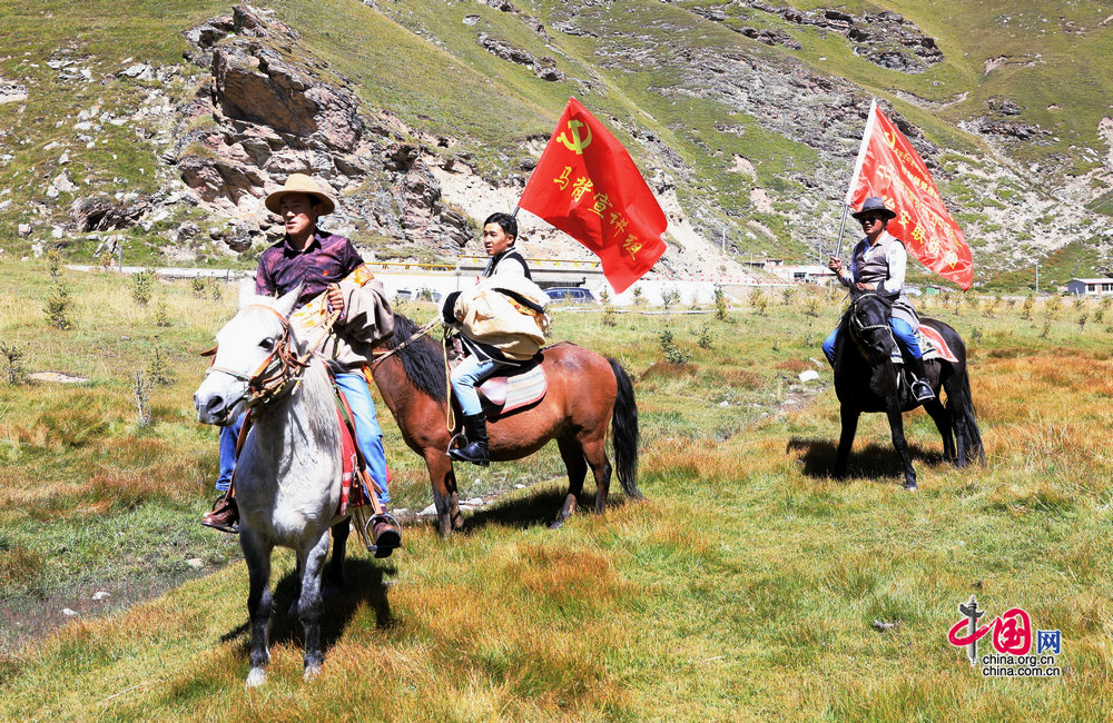 “马背宣讲队”让党的方针政策进入寻常百姓家。(摄影:孙磊)