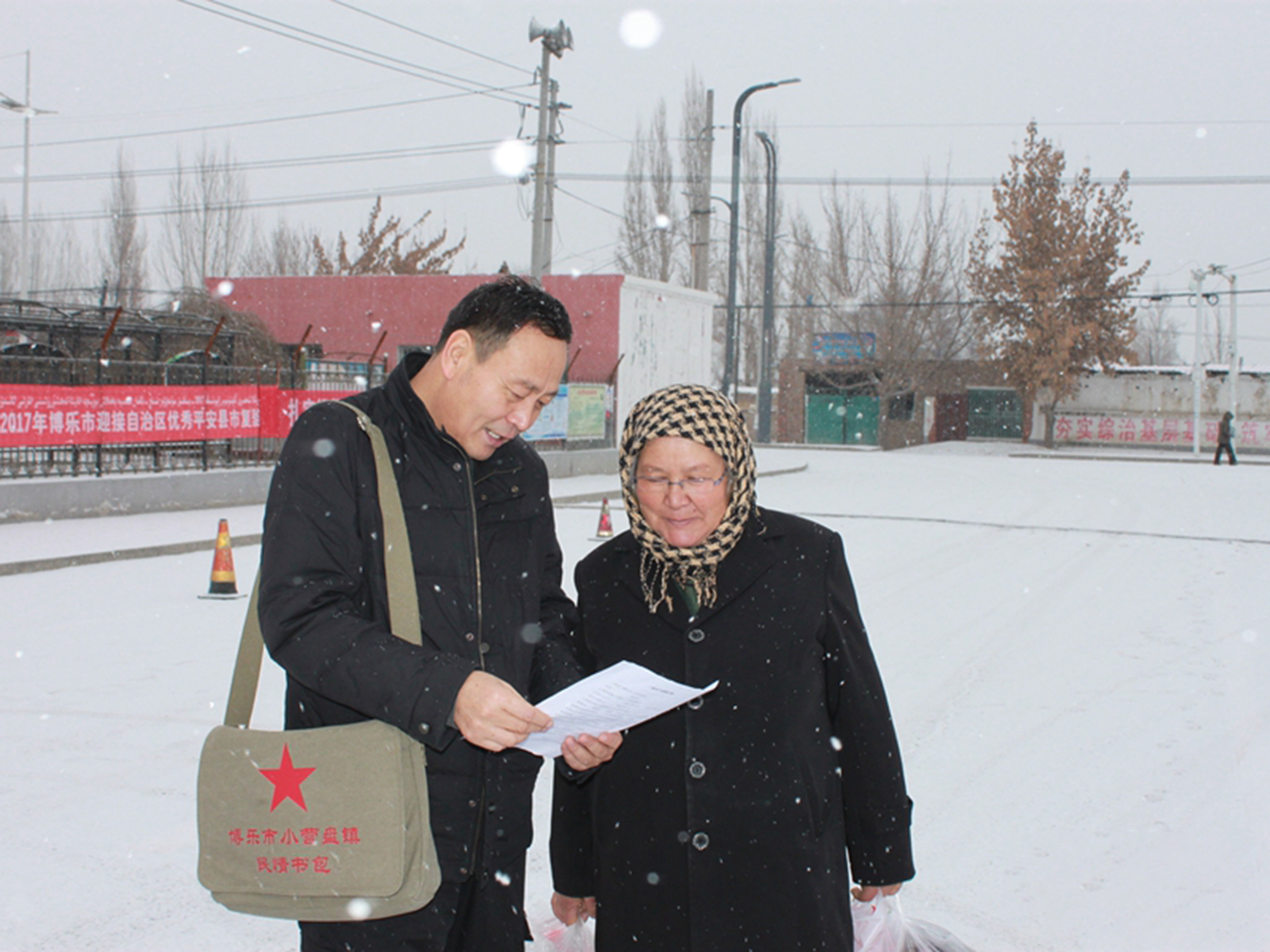 ▲ 2017年12月,新疆博乐市小营盘镇的“书包干部”在走访村民。