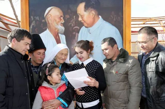 ▲ 托乎提汗·库尔班一家人在读习近平总书记的回信。