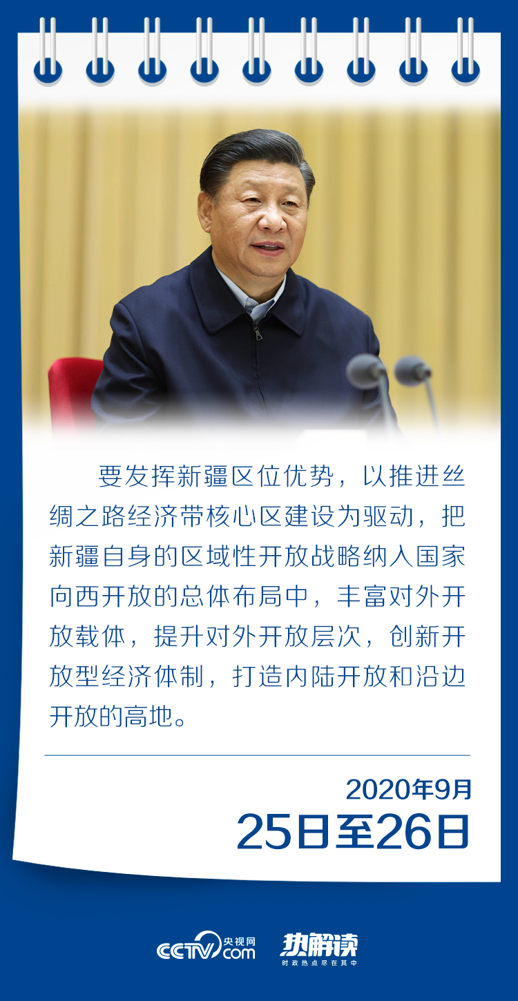 总书记说,要发挥新疆区位优势,以推进丝绸之路经济带核心区建设为驱动,把新疆自身的区域性开放战略纳入国家向西开放的总体布局中,丰富对外开放载体,提升对外开放层次,创新开放型经济体制,打造内陆开放和沿边开放的高地。