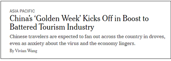 观察者网·大橘财经消息, 近日,美国《纽约时报》发表了一篇题为《中国“十一”黄金周提振遭受重创的旅游业》的报道。