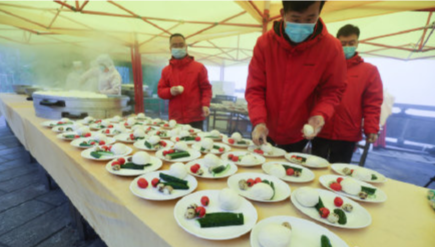 并有黄瓜段、圣女果、鹌鹑蛋等配餐
