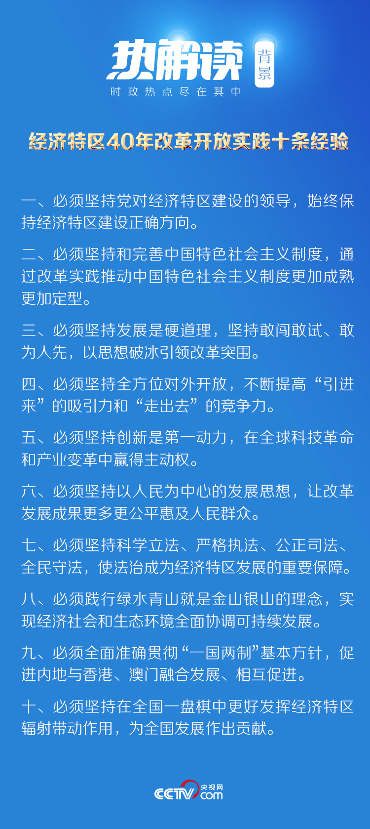 深圳经济特区的发展历程正是我国经济特区40年来改革开放实践的缩影。此次讲话中,习近平总书记从十个方面总结了深圳等经济特区40年改革开放、创新发展积累的宝贵经验。