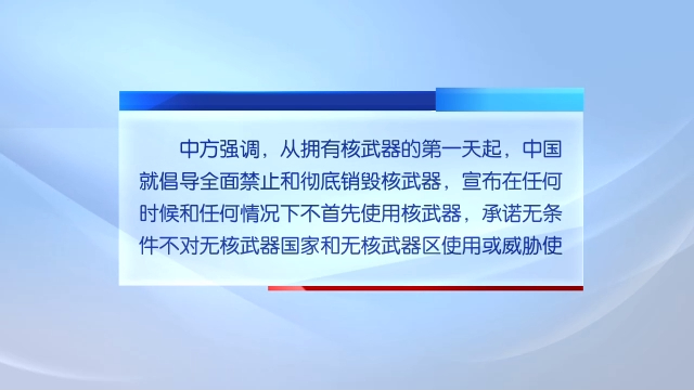 中方强调,从拥有核武器的第一天起,中国就倡导全面禁止和彻底销毁核武器,宣布在任何时候和任何情况下不首先使用核武器,承诺无条件不对无核武器国家和无核武器区使用或威胁使用核武器。中国是五核国中唯一作出这一承诺的国家。中国愿在相互尊重的基础上与各国就战略安全问题开展有意义的对话,将继续参加联合国、裁谈会、五核国框架下的军控讨论进程。