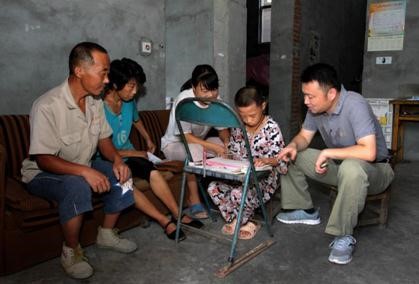 290万扶贫干部中的一员,在皖西北临泉县刘桥村(现已改名为刘桥社区)挂职工作的颜亮亮(右一),正在走访村民。(受访者供图)