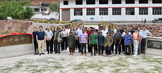 永济新桥开通仪式现场,同济大学校长一行和村民们合影。江平 摄